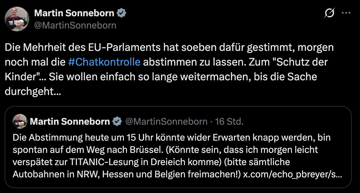 Ich stimme für Martin Sonneborns Vorschlag, anstatt Kontrolle von über 400 Millionen EU-Bürgern die verplichtende Chartkontrolle von Ursula von der Leyen und dem EU Parlament 😉