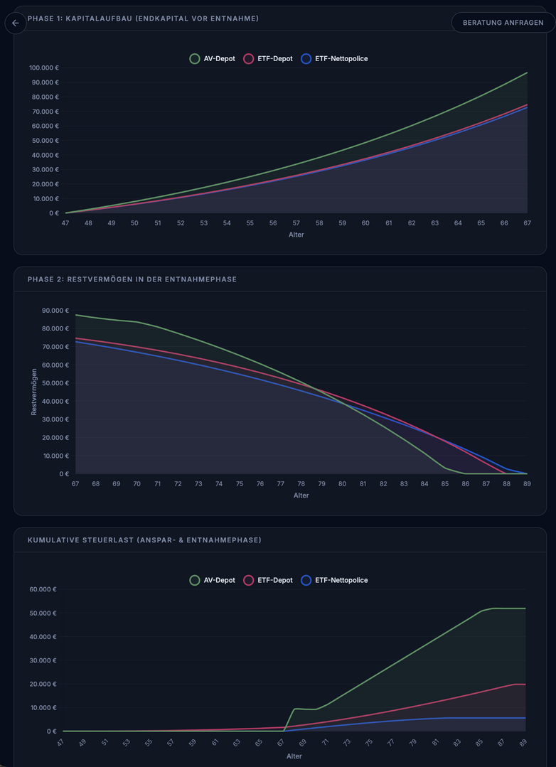 weil er nicht nur bis zum Ende der Ansparphase rechnet sondern auch die Entsparphase berücksichtigt. Und hier zeigt sich (unter der Annahme dass man ein Bruttojahresgehalt >57k€ hat, also in der Ansparphase einen Grenzsteuersatz von 42% und in der Entsparphase von 32%) dass die neue AV-Rente zwar zum Ende der Ansparphase deutlich vorne liegt aber dann aufgrund Steuernachteilen man letztendlich schlechter gestellt ist (in diesem Beispiel ist das Geld 2-3 Jahre früher alle als beim einfachen ETF-Depot). Das war mir so noch nicht bewusst und daher fand ich diese Visualisierung spannend.