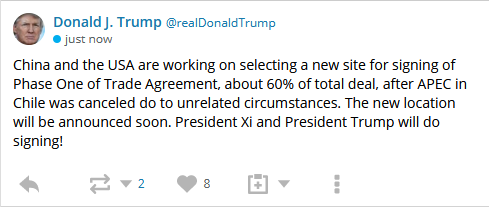China zweifelt wegen der impulsiven Natur Trumps daran, dass ein langfristiger Handelsdeal mit den USA möglich ist, berichtet Bloomberg. Die chinesische Führung sieht demnach das Risiko, dass Trump sich auch aus dem begrenzten Deal, der in den kommenden Wochen unterzeichnet werden sollte, zurückziehen könnte. Chinesische Regierungsbeamte hätten zudem gewarnt, dass sie in strukturellen Fragen nicht nachgeben würden. Zudem bestehe China auf einer Streichung sämtlicher Strafzölle, bevor Verhandlungen für einen "Phase-2-Deal" beginnen könnten.