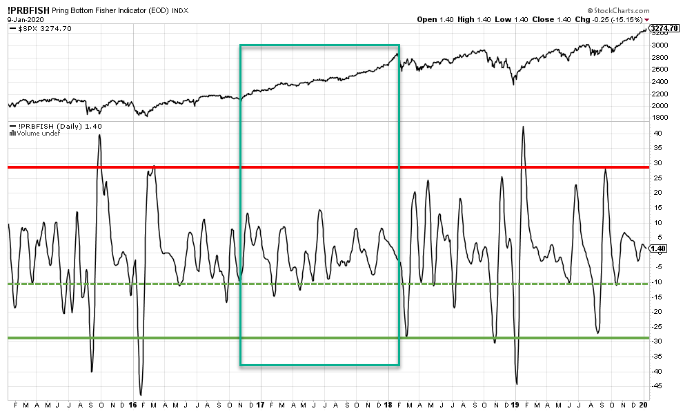 Der Pring Bottom Fisher zeigt aktuelle auch keine Überreizung nach oben. Er liegt in einem Bereich in dem er den ganzen Bullenmarkt Ende 2016 bis Anfangs 2018 war.