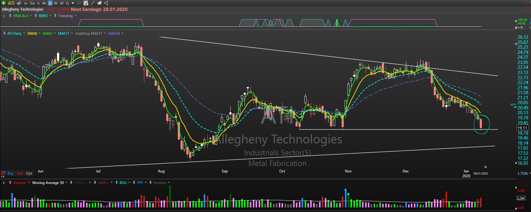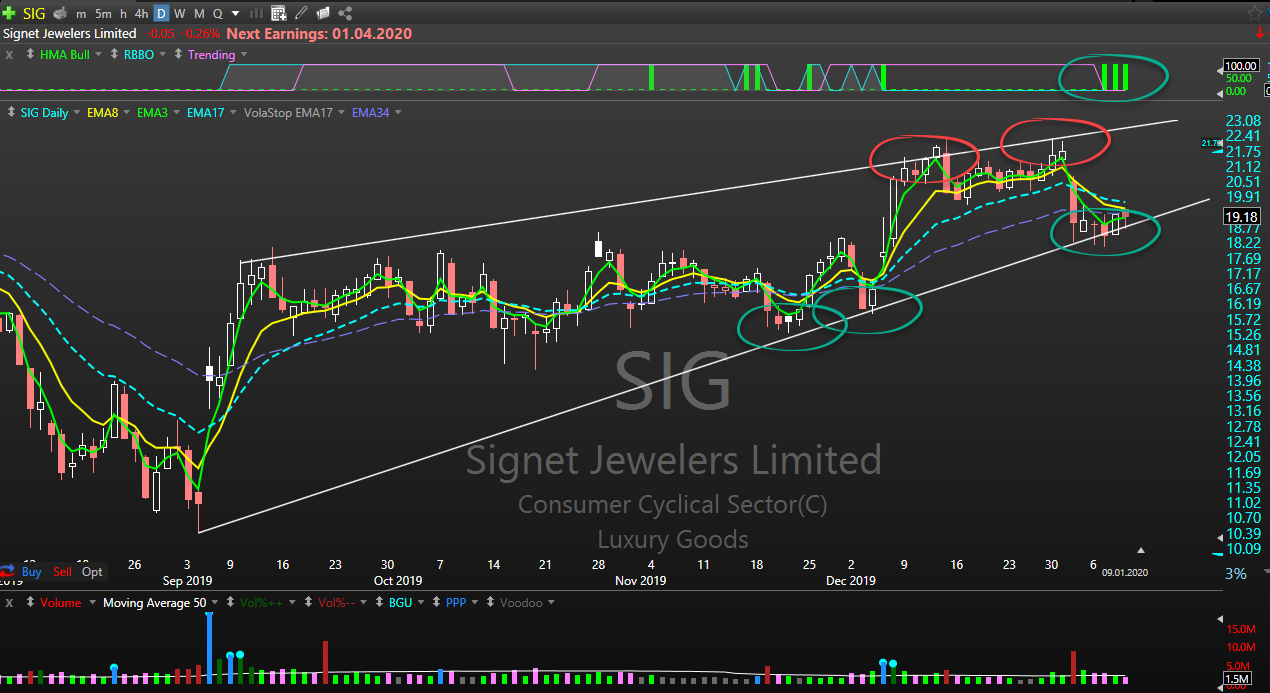 SIG ist wieder Unterkante Trendkanal zurück gefallen. Jetzt allerdings mit einem HMA Bull Cluster und einem Kanal-Boden. 15% Trading-Chance bis an die Oberkante Trendkanal!