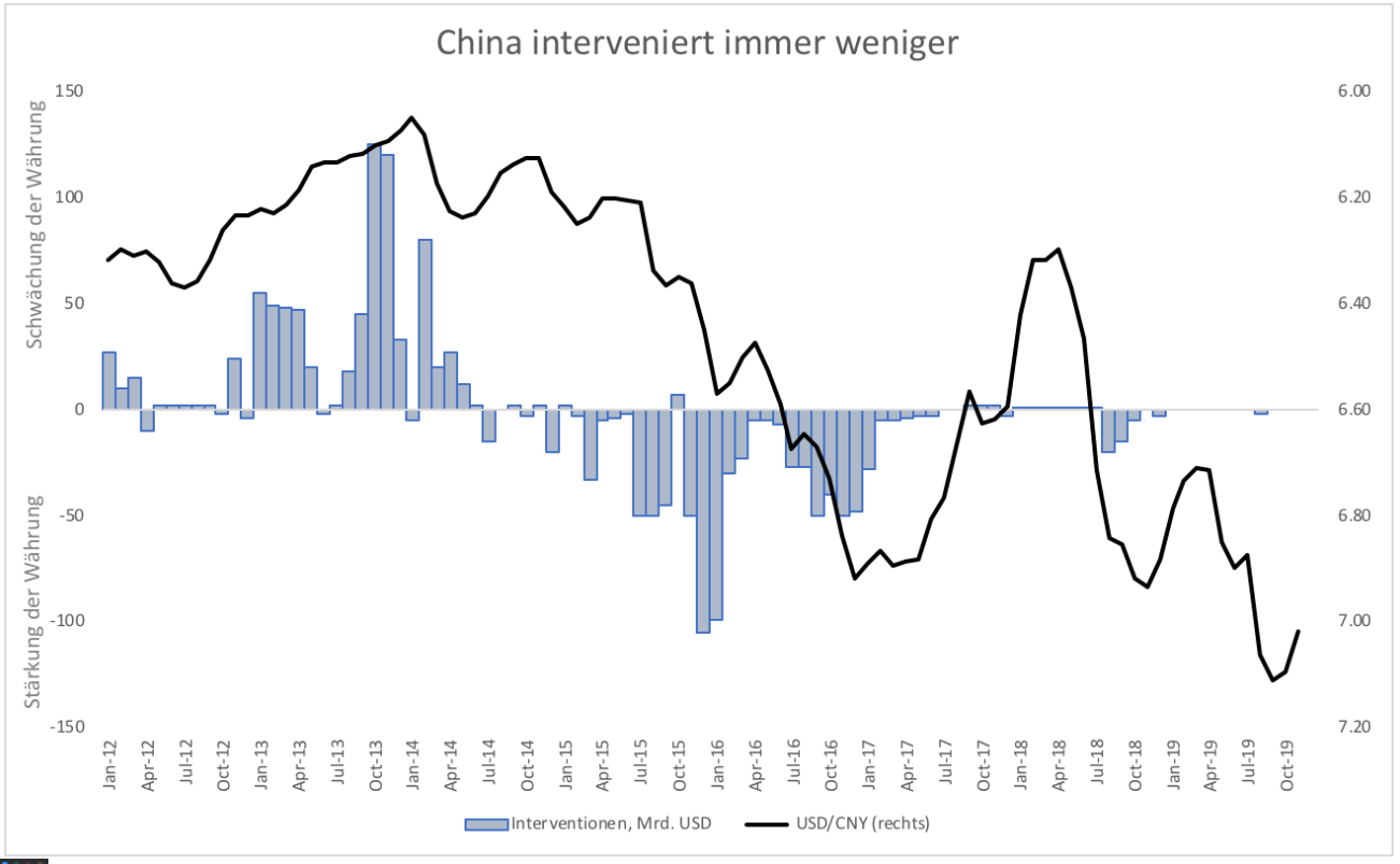 Die Chinesische Notenbank intervenierte bis 2018 regelmässig auf dem Devisenmarkt. Bis 2014 intervenierte sie, um die Aufwertung des Yuan zu verlangsamen. Wegen eines Leistungsbilanzüberschusses und Kapitalzustroms aus dem Ausland wertete die Währung immer weiter auf. Um den Trend zu verlangsamen, musste interveniert werden.