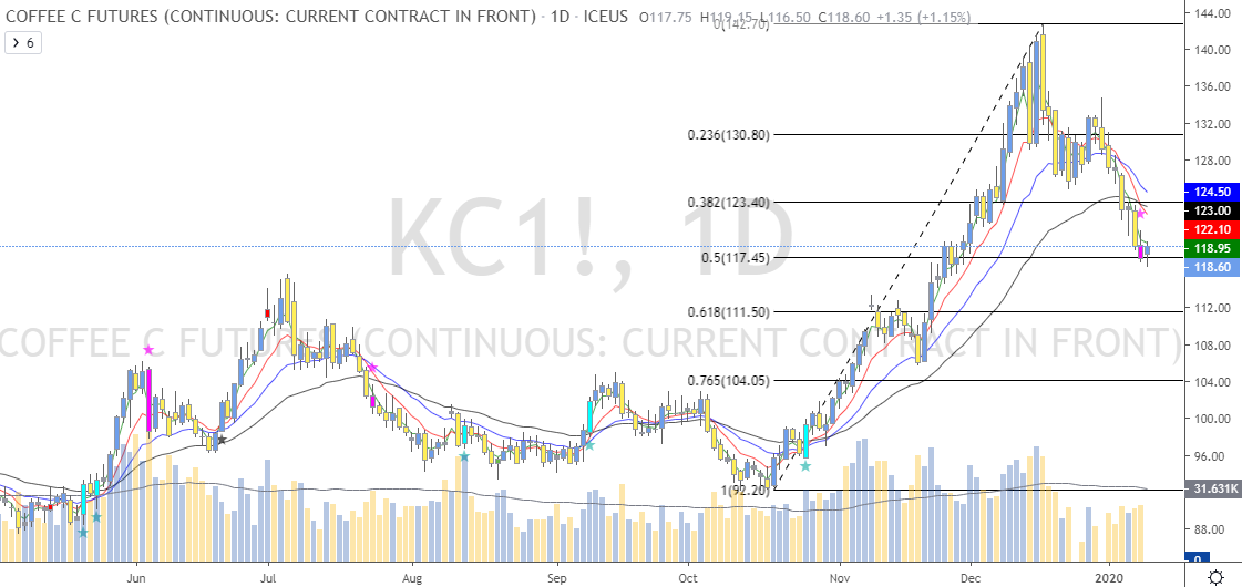 Kaffee steht aktuell in einem Mean-Reverse Bereich am 50er Fibonacci. Die steile Rally war aus fundamentaler Sicht allerdings nur schwer nachvollziehbar, da die Aussicht auf ein Hochertragsjahr besteht und eine damit einhergehende Rekordernte in Brasilien. Angesichts des zu erwartenden beträchtlichen Angebotsüberschusses im kommenden Erntejahr ist der aktuelle Preisrückgang nur konsequent und könnte sich erst noch bis 111 US-Cent/Scheffel fortsetzen.
