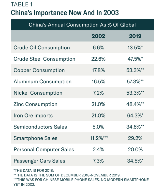 13,5 % des weltweiten Ölverbrauchs geht derzeit (2019) auf China zurück, China steht für 47,5 % der weltweiten Stahlnachfrage und für 53,3 % der weltweiten Kupfernachfrage. 34,5 % aller PKW Verkäufe weltweit gehen nach China.