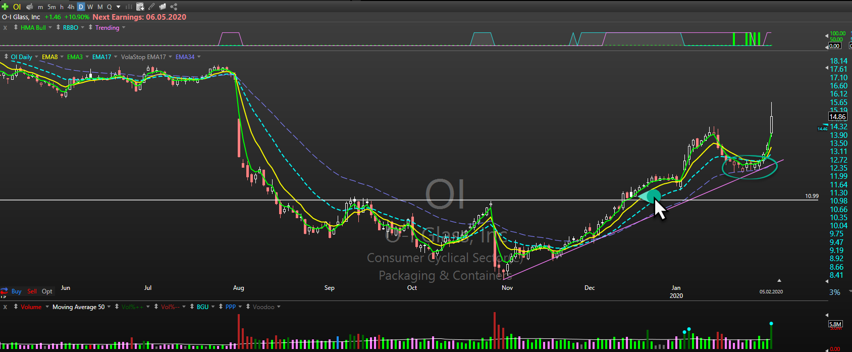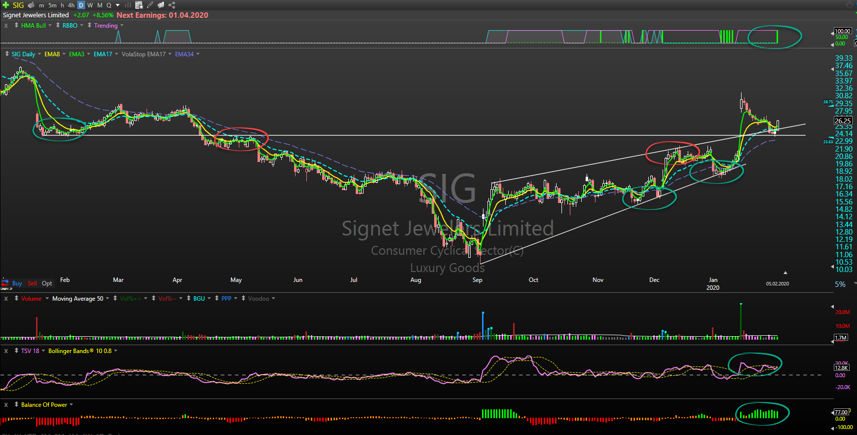 SIG fällt ziemlich auf. Nach einem 40% Upgap letzte Woche wegen starker upside Guidance (same store sales to rise 0.1% to $6.1B vs. a prior expectation for negative growth) nun mit schönem Low Volume Pullback.