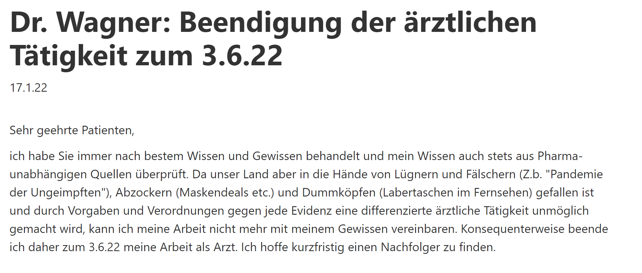 Der Schlingel hatte schon im November unverschämtee Aussagen getroffen: "Die Corona Booster Impfung wird nach reichlicher Überlegung von der Praxis Wagner nicht angeboten. Leider erscheint uns die in unserem Patientenklientel erkennbare Nebenwirkungsrate zu hoch" "Nebenwirkungen werden bekanntermaßen schlecht erfasst."