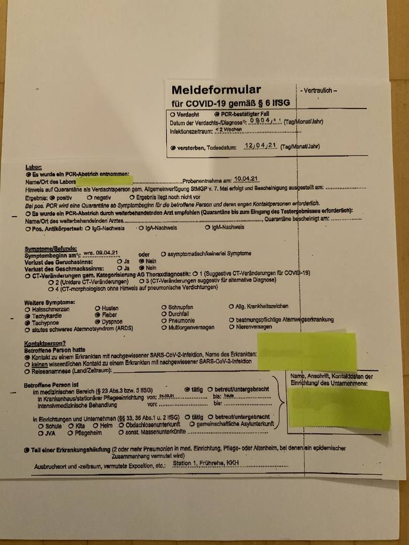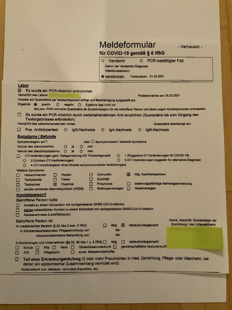 Ansonsten geht es mir aber wie Dir - ich muss nach bzw. vor meiner Arbeit nicht jeden Beitrag kommentieren bzw. mich zu jedem Argument äußern. Abschließend aber noch die Anmerkung, dass die täglich kommunizierten Todesfallzahlen nach meiner Kenntnis auf Grundlage von Meldungen an die Gesundheitsämter basieren. Leichenschauscheine/Totenscheine dürften in diesem Zusammenhang keine Rolle spielen. Ich habe mal 2 Beispiele eingefügt. Die Meldungen kamen aus 2 unterschiedlichen Bundesländern, so dass die Meldeformulare deutschlandweit größtenteils einheitlich aufgebaut sein sollten.