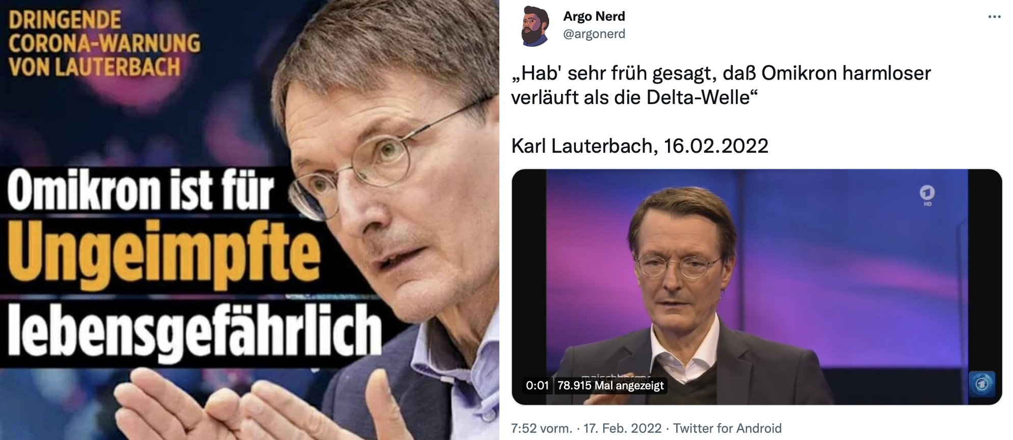Ich würde schon sagen, dass nicht alles stimmt, was er sagt. Lauterbach ist auch nicht meine bevorzugte Quelle. Er ist zuerst Politiker und dann Wissenschaftler. Das hat Auswirkungen auf das, was er sagt. Wenn man es ganz genau anschaut, müssen die Aussagen allerdings kein Widerspruch sein. Omikron kann harmloser als Delta sein, aber trotzdem immer noch gefährlich. Inzwischen sind es allerdings tatsächlich eher die noch ungeimpften/immunsupprimierten Älteren, die durch die höhere Infektiosität dem Virus nicht mehr ausweichen können. Die 50-Jährigen müssen aktuell nicht mehr auf die Intensiv, wie es noch bei Delta der Fall war. Omikron hat alles schon etwas einfacher gemacht ?