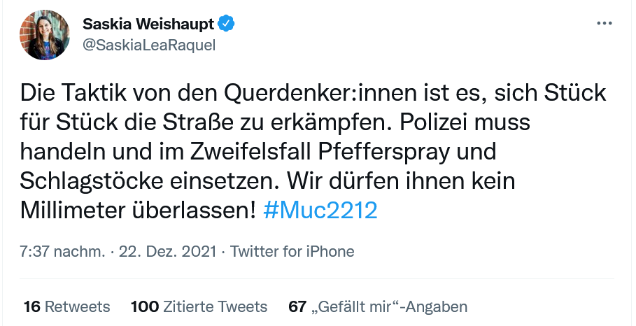 Ich habe auch nichts gegen friedliche(!) Spaziergänge in großen Gruppen im Freien, Masken zum Schutz aller und nicht direkt vor Kliniken würde mich aber freuen. Man wird mit Maske auch viel schlechter erkannt ? ihr dürft so viel unternehmen und protestieren, wie ihr wollt. Hauptsache ihr landet am Ende nicht auf der Intensiv. Alles andere ist mir ehrlich gesagt Scheiß egal.