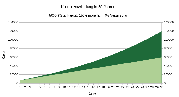 2.) Mit meinen damals Ende 30, Schulden aufs Haus und gerade das erste Mal eine 5-stellige Summe auf irgendeinem Konto, schien eine damals utopische Summe von 100.000 Euro plötzlich doch bis zur Rente erreichbar. 150 Euro monatlich über 30 Jahre bei konservativen 4% und ich hätte meine elende abgeschlossene Zusatzrente locker übertroffen.