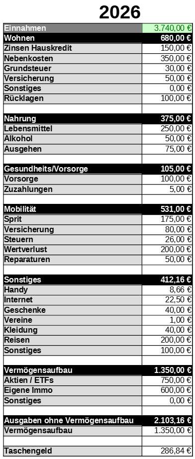 Ich hab das mal versucht zu aktualisieren, auch wenn wir weiterhin größtenteils getrennte Konten haben, habe ich bei den Ausgaben wo meine Frau sich mit einbringt nur meinen Teil angegeben.