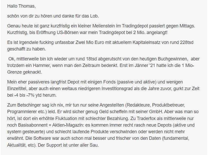 Sollte nichts schlimmes passieren, werde ich mich nicht melden, und erst anschließend die Trades nachmelden, die getriggert wurden.