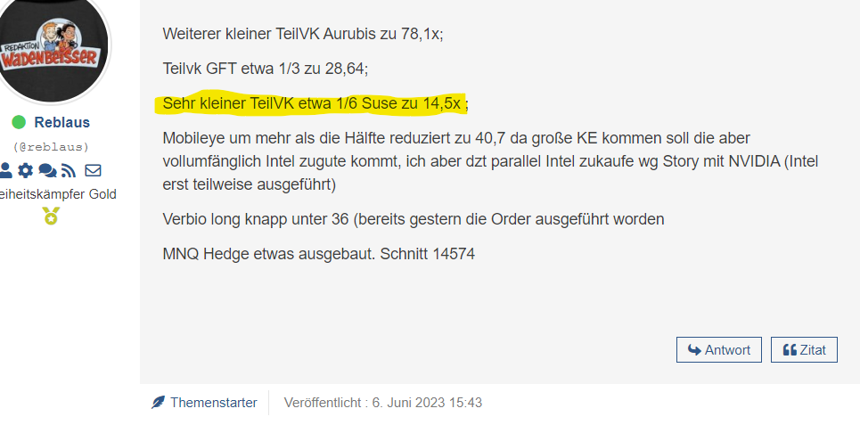 Vermutlich kommt es dann Anfang nächster Woche zu einem Peak, aufgrund der vielen Passivinvestoren, die zum Ultimo/Monatsersten ihre ETF Sparpläne laufen haben, aber auch die aktiv gemanagten Fonds haben starke Mittelzuflüsse. Ich gehe weiterhin von einem mühsamen zweiten Halbjahr aus, in dem die Rezessionsängste zunehmen werden und sich dies auch in Zahlen und Bilanzen niederschlägt. Wenn dies nicht der Fall ist, bzw. das Softlanding tatsächlich als solches von der Börse Abgefrühstückt wird, hätte ich da noch einen Cashpolster von gut 20 bis 23% und wenn es das Gesamtdepot zulässt, könnte ich auch mal wieder in eine 100+% Investitionsquote hinein gehen. Aber erst einmal heißt es die Jahres-Performance im Bereich von +30 bis +36% zu verteidigen.