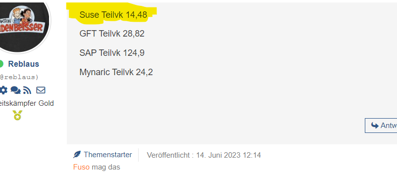 Den Rest (ca. Hälte,), würde ich gerne um 12,6 oder höher abstossen, da bräuchte ich aber einen Bitcoin Kurs unter 23500). Schau ma mal