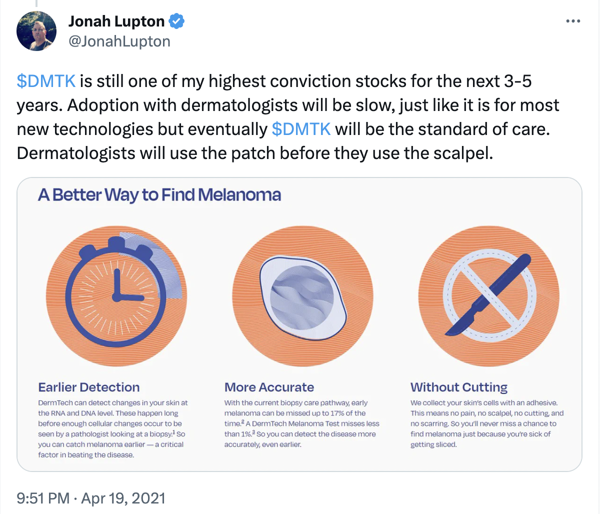 In 2021 waren seine highest conviction stocks Perlen wie DMTK, TIGR, DM, GRWG, HIMS, PRCH. Alle brutale Verlustbringer. Ich habe ihn geblockt.