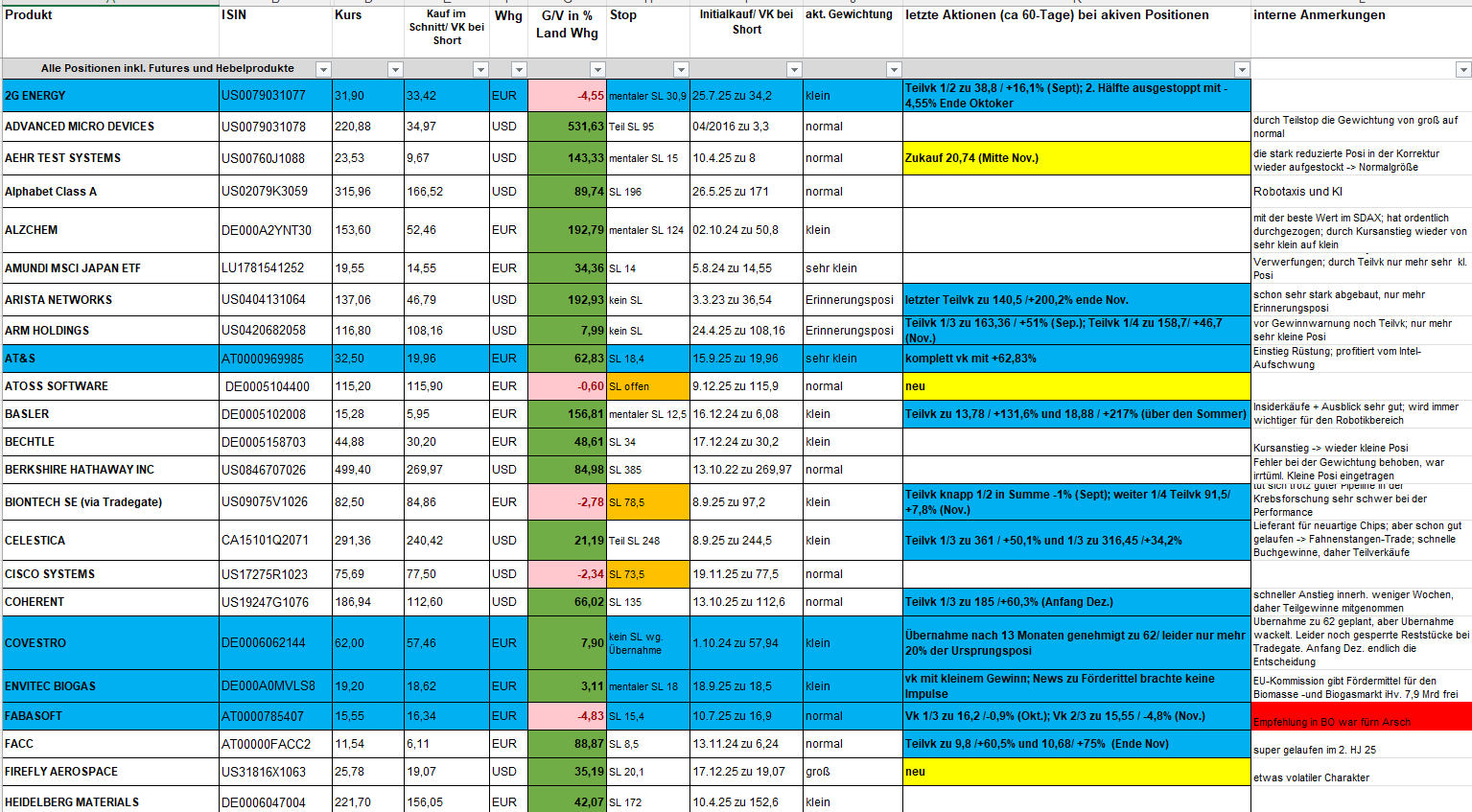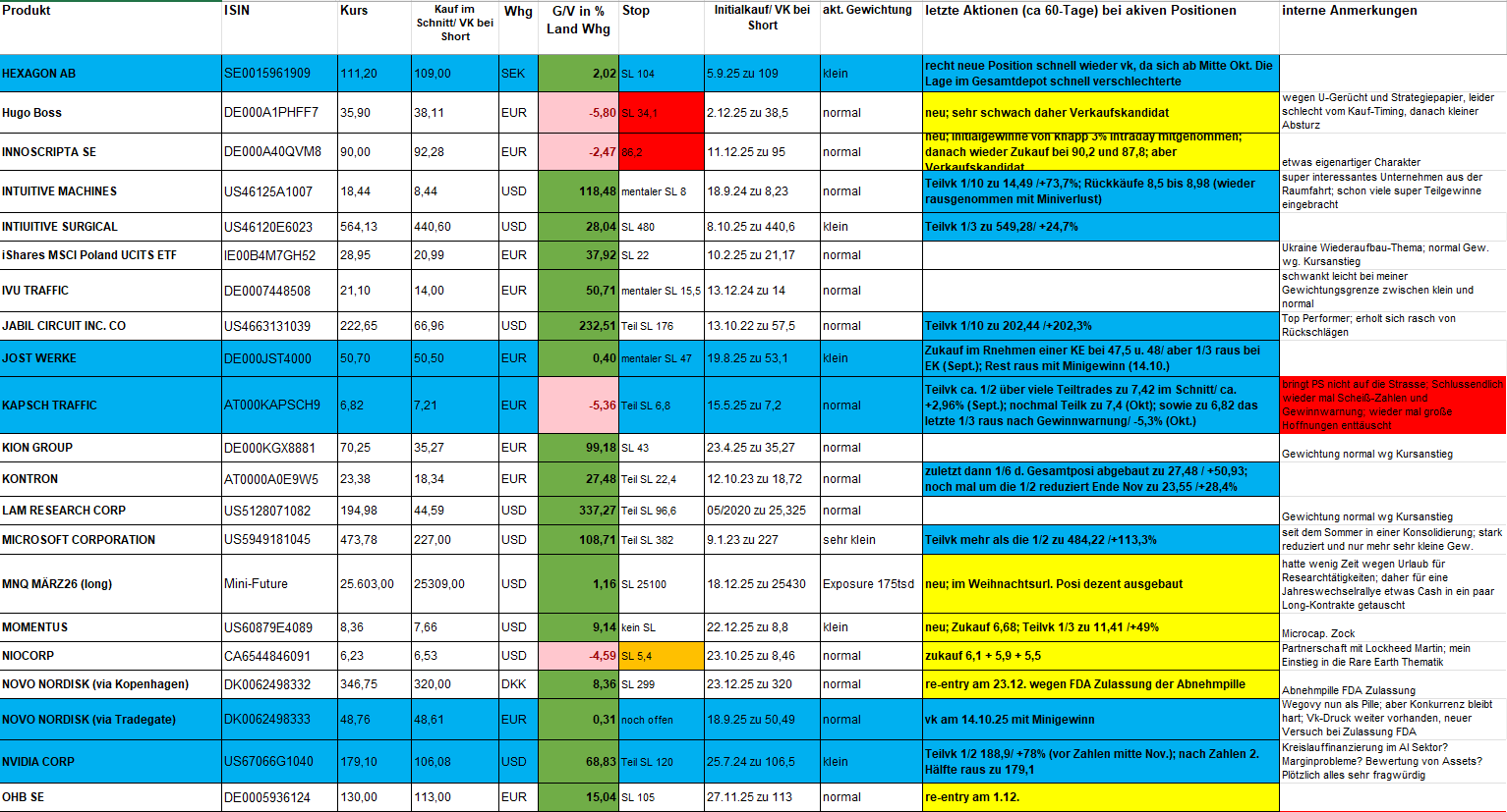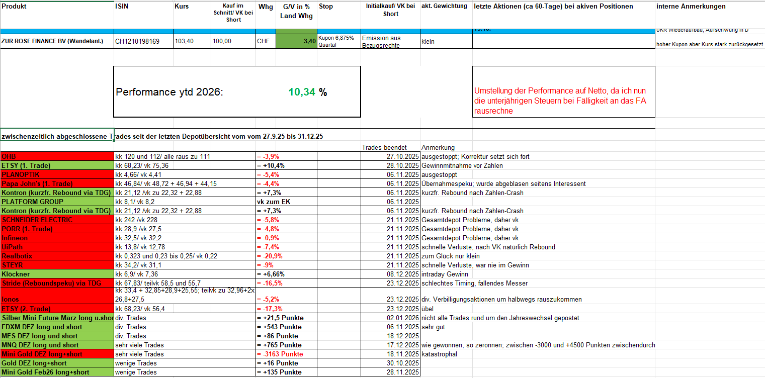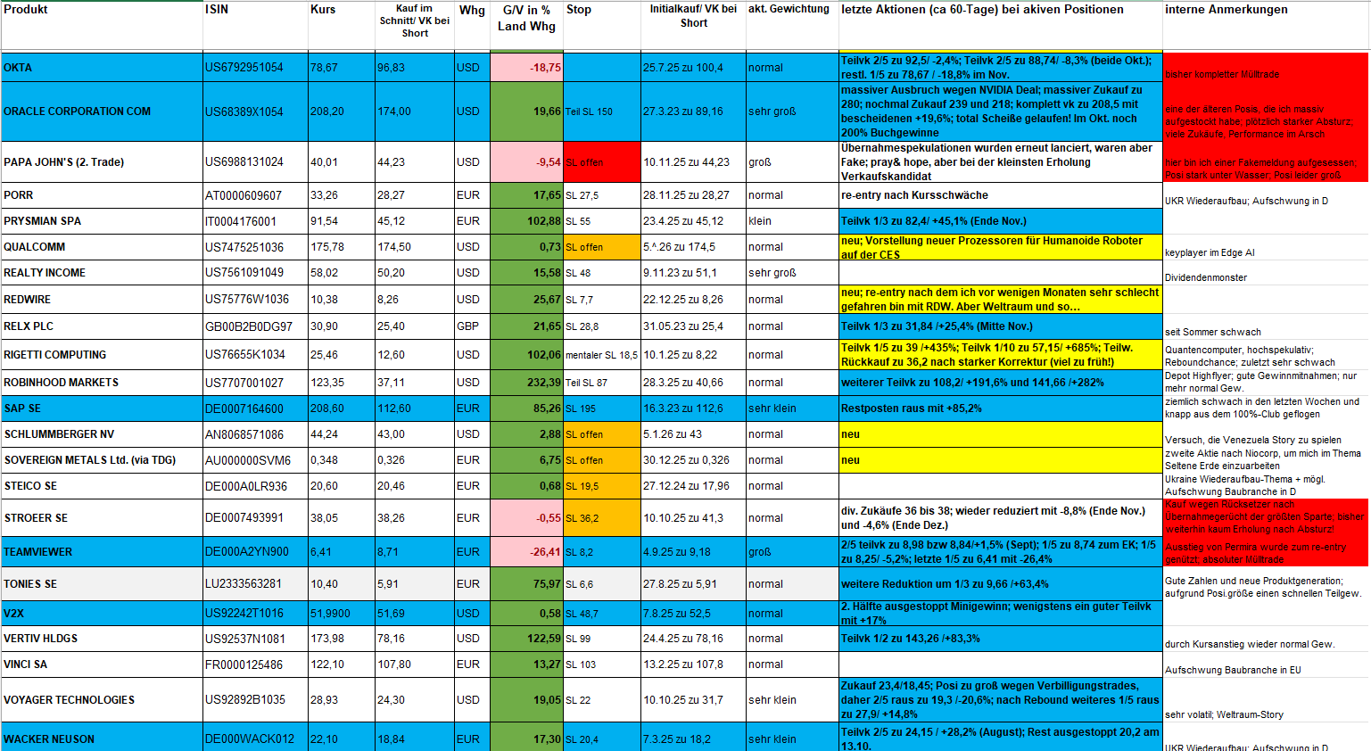 Das verrückte Jahr 2025 lief performancemäßig ok bis +11,xx% Anfang April), dann Rosengarten-Scheiße (-12,8% in der 2. April Woche); dann ausgeglichen bis Anfang Mai mit -1,9%; es folgte ein schöner Sommer mit +19% Mitte Juli; +21/22% Ende August; +29% Ende September; Irre 3 Wochen im Oktober auf +43%; dann einen Krankenstand und viel Arbeit im Job und einige Tage digital detox einen Monat später der totale Filmriss und es ging wieder unter 20%; hektische Anpassungen und fettes Hedging im Nov/Dez verursachten gemeinsam mit dem Absturz einiger wichtiger Depotsäulen wie Oracle, Robinhood, Rigetti, Jabil etc, und einige megaschwache Neukäufe wie Übernahmegerüchte in Papa John's, Stroeer, aus denen nichts wurde; oder anderer Super-Rohrkrepierer wie Okta, Teamviewer, Etsy, Stride ein Abfall auf +14%, von denen ich mich nicht mehr vernünftig erholt habe.