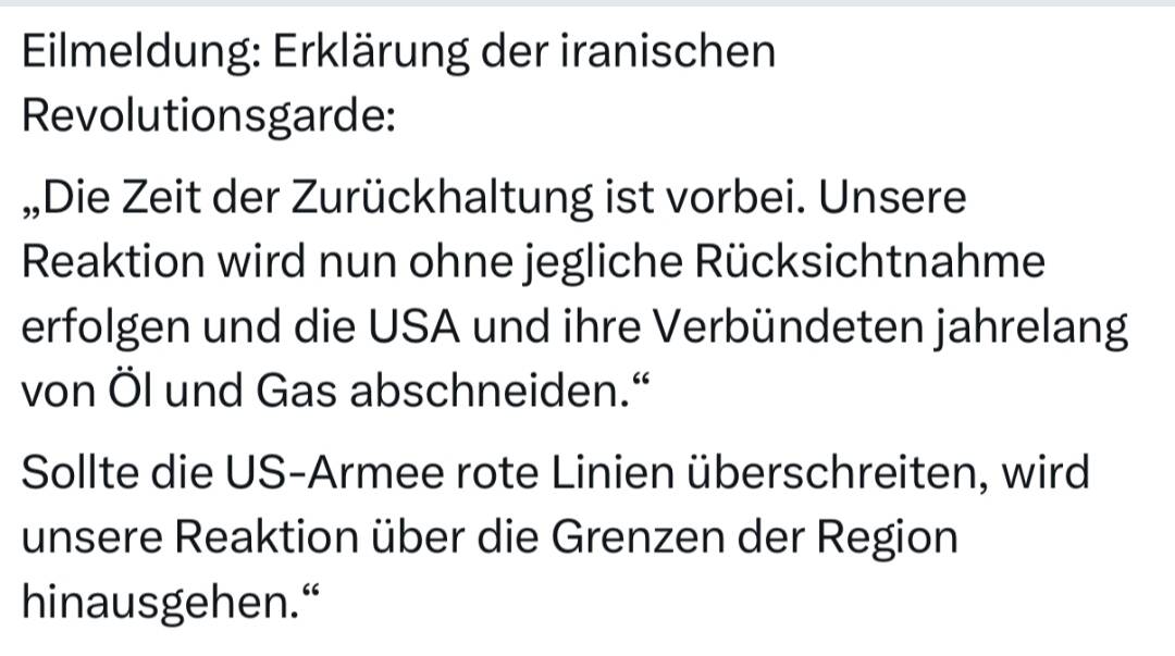 „Die regionalen Partner der USA sollten ebenfalls wissen: Bis heute haben wir aus nachbarschaftlichen Gründen große Zurückhaltung bewiesen und bei der Auswahl der Ziele für Vergeltungsschläge bestimmte Einschränkungen gehabt, doch nun wurden alle diese Einschränkungen aufgehoben“.