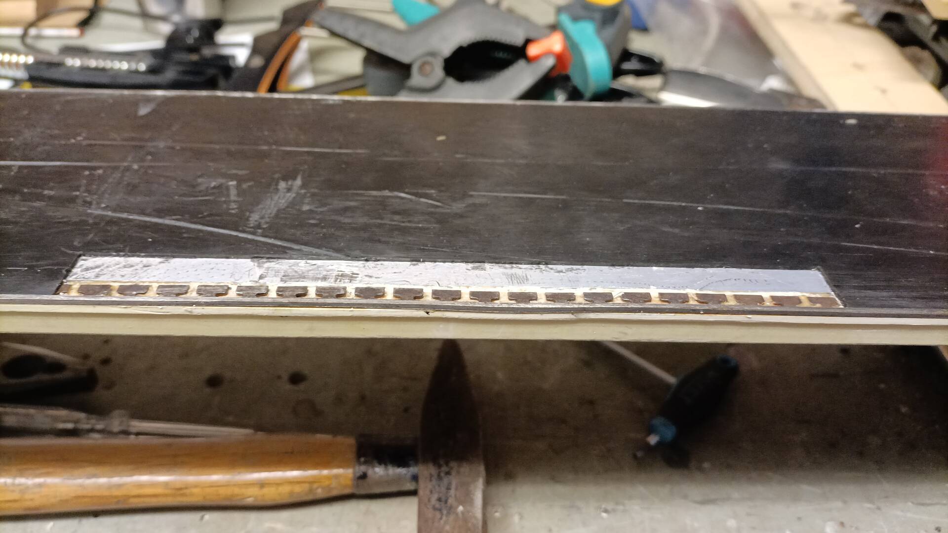Am Samstag habe ich dann meinen Ski-Reparatur Horizont erweitert, Seitenwange geklebt, bei einem anderen Ski ein größeres Belagstück ausgebessert und die ausgerissene Kante wieder befestigt.
