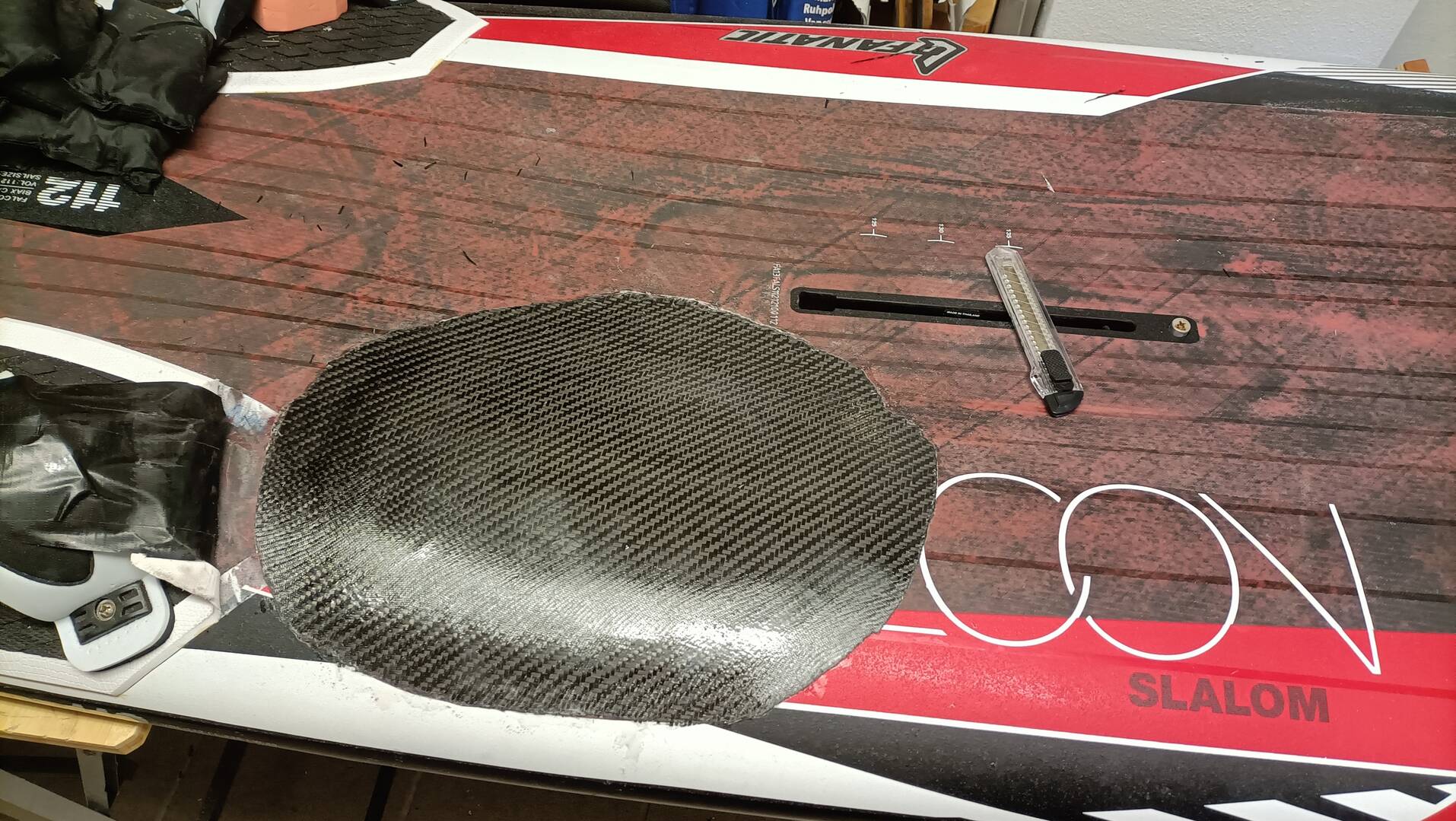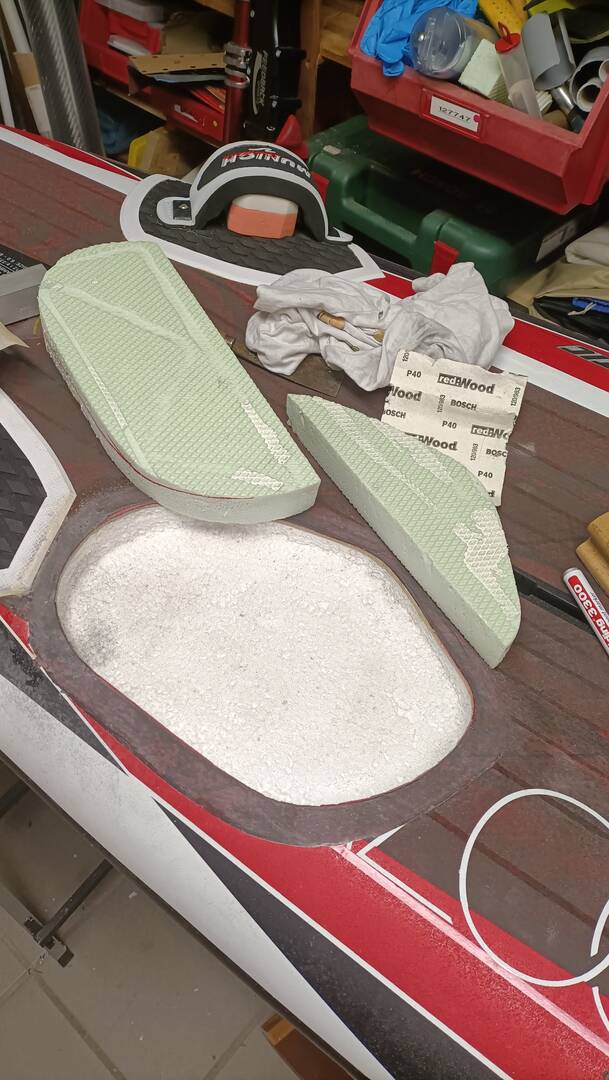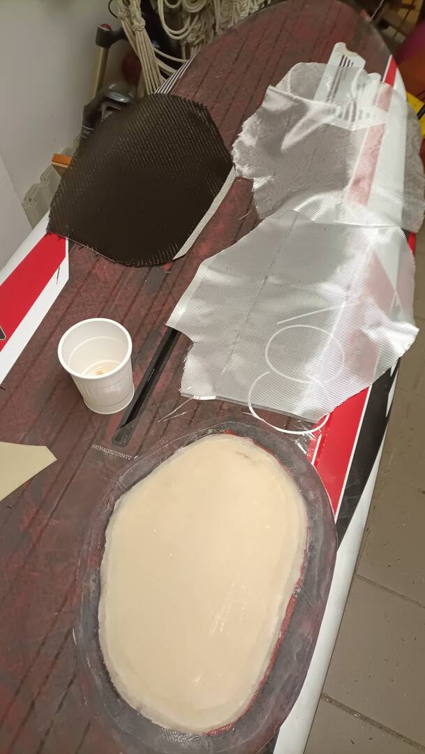 Heute habe ich ein neues Reparatur Projekt am Surfbrett gestartet. Es war an einer reparieren Stelle von Vorbesitzer undicht und ist dann dort weich geworden. Habe den weichen Kern an der Stelle entfernt, jetzt muss ich es wieder aufbauen...