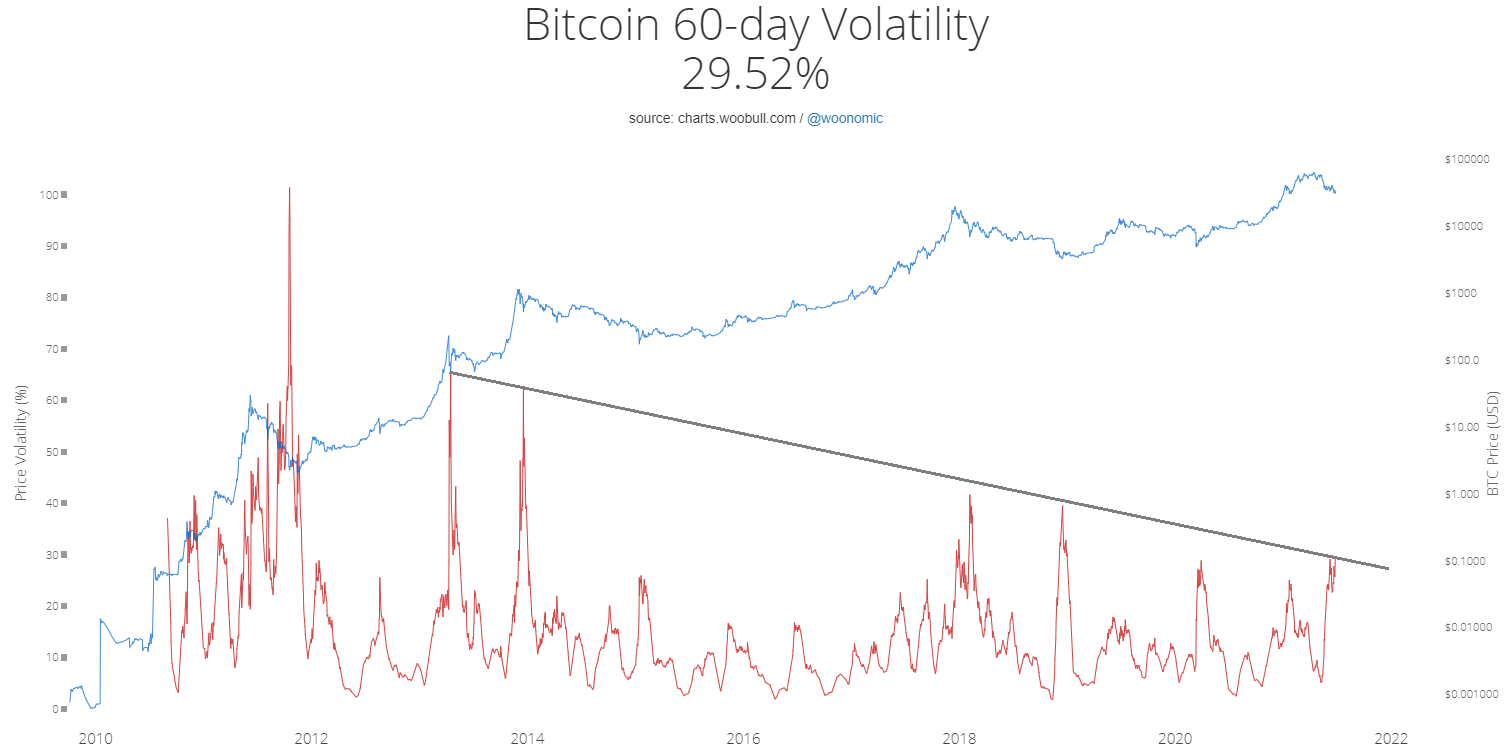 Schöne Darstellung Entwicklung Volatilität Bitcoin seit Beginn
