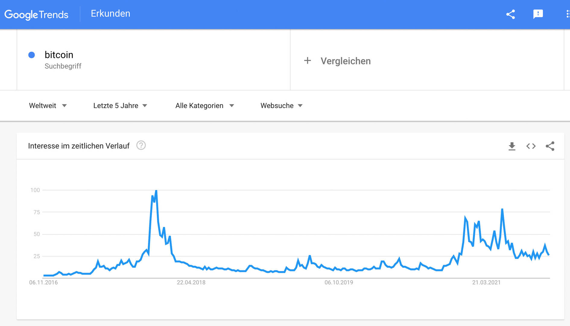 Die Suchanfragen sind zurzeit eher niedrig. Man kann schön das Top im Dezember 2017 erkennen und die Hochpunkte Januar-Mai dieses Jahr.