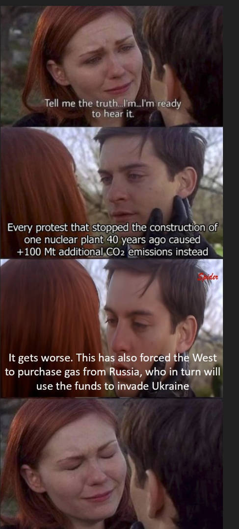 Du hast zu jedem Thema tolle Memes, Schemata, Bildchen - das sagt mir leider gar nichts, die Cartoon-Sichtweise ist mir zu einfach. Ich sehe die Probleme, die in Jabiluka/Australien durch das Uran-Mining entstehen, ich sehe, dass diese Technologie durch Unfälle grosse Gebiete aus der Welt herausstanzt als unbewohnbar, auf Generationen hinaus, oder wer weiss eigentlich schon wie lange. Ich sehe Halbwertszeiten, mit denen der Atommüll sicher "endgelagert" werden soll, die über die geschichtlich aufgezeichnete Entwicklung der Menschheit hinausgehen. Und ich sehe die friedliche Nutzung der Atomenergie, die an mehreren Stellen der Welt vorgeschoben wird, um noch ein Land mehr mit dem Wahnsinn der Atombomben zu bestücken. Glaub mir, Kernspaltung ist NICHT der Weg. Ich bin mir sogar relativ sicher, dass irgendwann in unserer oder der nächsten Generation der Moment kommt, an dem alle ganz furchtbar bereuen, dass wir damit überhaupt angefangen haben.