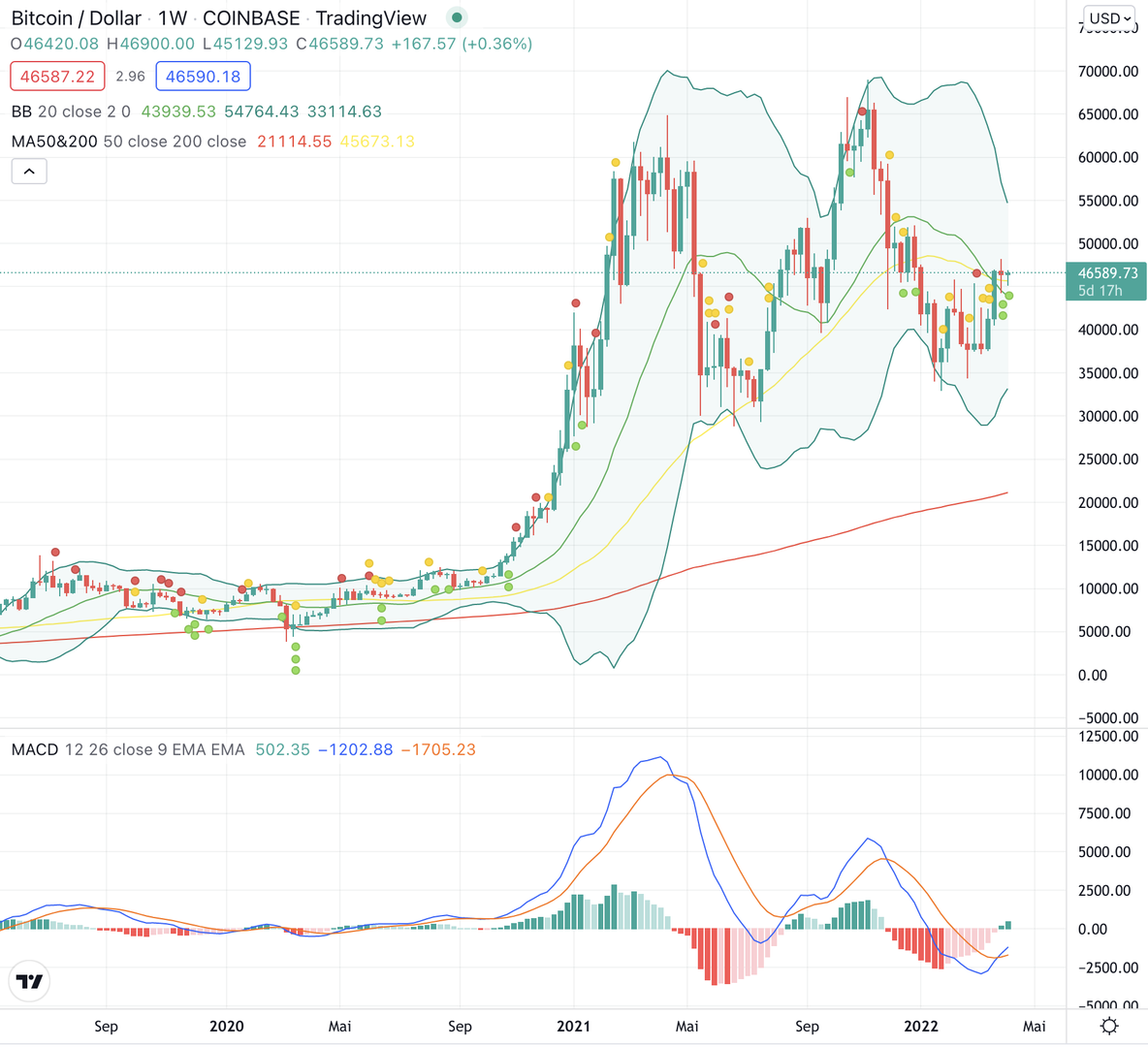 Es ist relativ still geworden um Bitcoin, was eine gute Sache ist und dem Kurs die Chance gibt sich zu stabilisieren und zu einer neuen Rally anzusetzen... und es sieht genau danach aus - ich bin recht bullish für die nächsten Monate. Im Wochenchart sieht man auch, dass der MACD gekreuzt hat, somit kann die neue Rally jetzt starten.