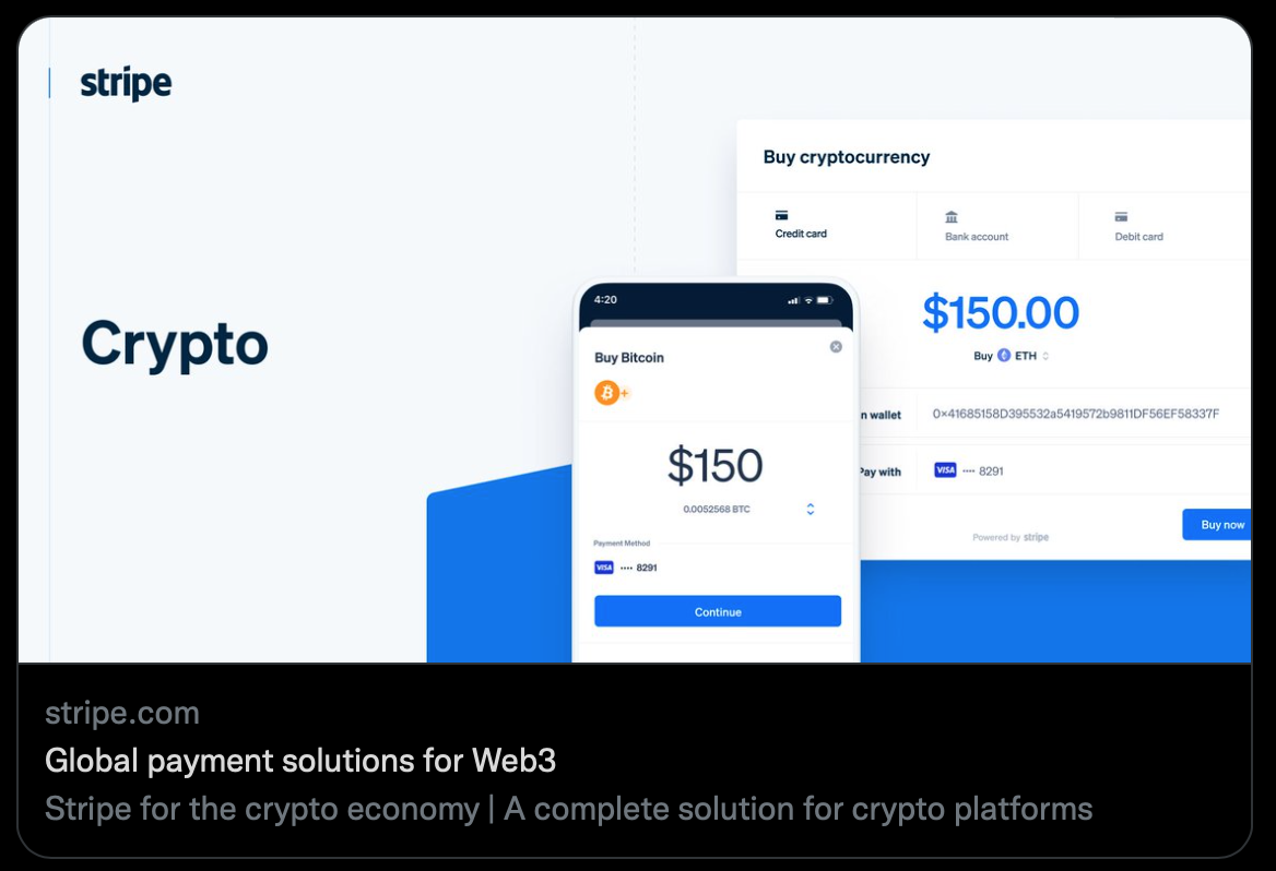 Auch sehr interessant: Einer der größten online Zahlungsdienstleister "Stripe" (Bewertung Series H im März 2021: 94,4 Milliarden USD) steigt wieder ins Krypto-Geschäft ein. Das ist eine große Sache, da Stripe viele Online-Geschäfte weltweit mit unterschiedlichen Zahlungsoptionen versorgt und das Hinzufügen von Krypto-Zahlungen extrem vereinfacht wird.