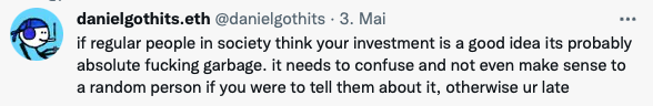 "Wenn normale Menschen in der Gesellschaft denken, dass Ihre Investition eine gute Idee ist, ist sie wahrscheinlich absoluter Müll. Sie muss verwirren und nicht einmal für eine zufällige Person einen Sinn ergeben, wenn Sie ihr davon erzählen, sonst kommen Sie zu spät."