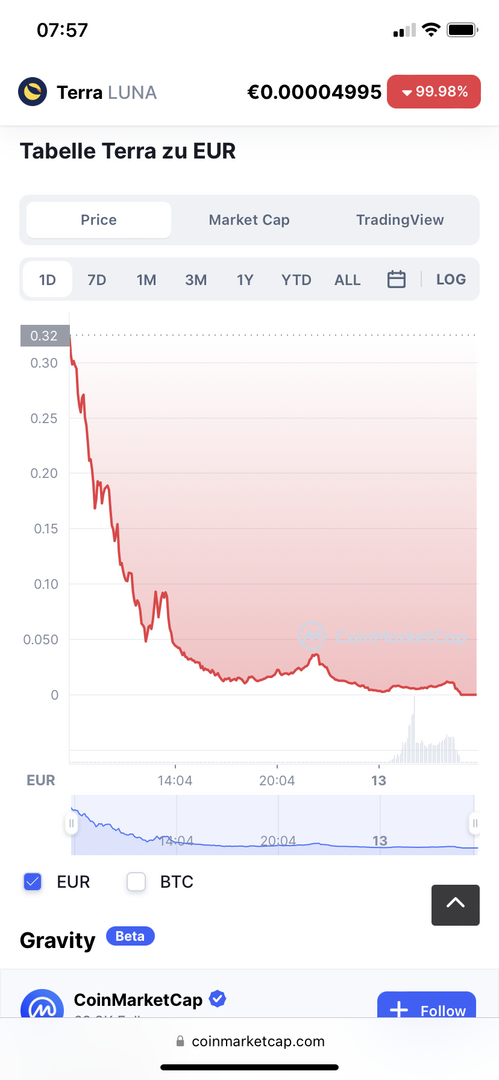 Das ist aus Wikipedia, woanders las ich, dass Terra den Dollar-Peg durch financial engineering halten würde. Ohne mich mit dem Konstrukt en detail auseinanderzusetzen, hier hat jemand versucht, Dollars aus dem Nichts zu schöpfen... ohne dass er die Notenbank wäre. Wer so etwas glaubt, ist wirklich selbst schuld. Der Preis ist jetzt halt wieder im Einklang mit dem Wert der Bits und Bytes. Auch noch aus Wikipedia: