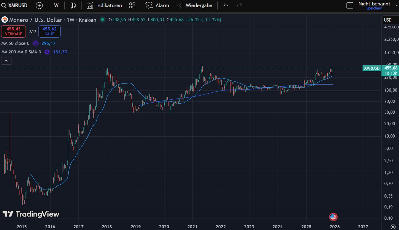 Ich habe vorletztes Jahr Monero aus meinem Kryptoportfolio rausgeworfen. Ja, ich denke Monero ist der besten Privacycoin und Privacycoins haben eine Story/Anwendungsfall - aber ich denke sie werden Opfer der Regulierung und mittelfristig nur noch eine Darknet-Randerscheinung sein. Manche Walletanbieter und Kryptobörsen haben Monero delistet um Regulierungsbestimmungen nachzukommen (oder im vorauseilenden Gehorsam). Daher sehe ich Monero bärisch seit die 200-Wochen-Linie durchbrochen wurde.