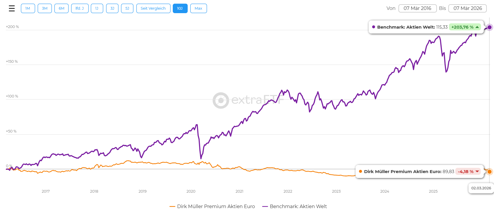 Beim 10-Jahresvergleich des Dirk Müller ETF vs einfacher All World ETF total return wird das ganze Drama sichtbar: