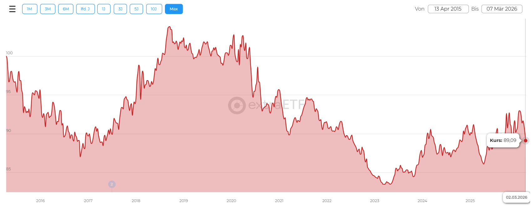 Aus 100 Euro bei ETF Gründung wurden knapp 11 Jahre später nominal ca. 89 Euro.
